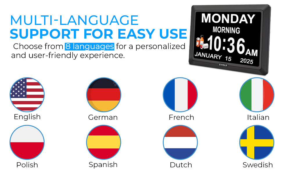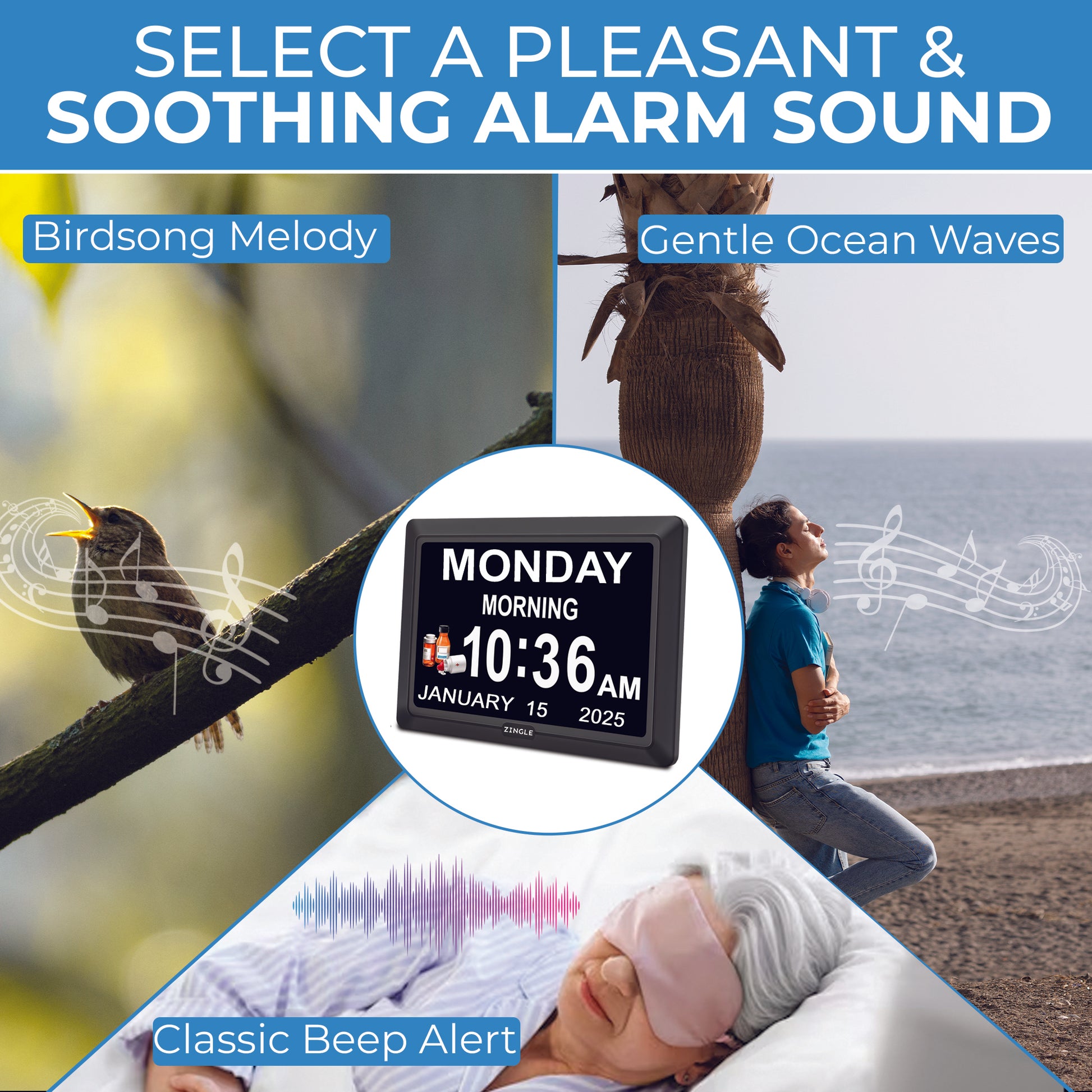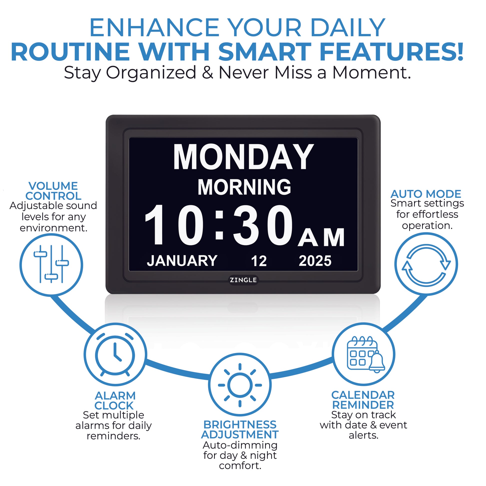 Whether you’re caring for an ageing parent, teaching little ones a healthy sleep routine, or simply staying on top of a hectic schedule, our 10-inch Digital Calendar Day Clock brings calm and confidence to every room.